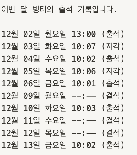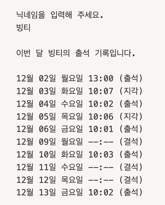- 출석 기록이 없으면 채워 넣은 뒤 시간은 표기를 안 한다는 점