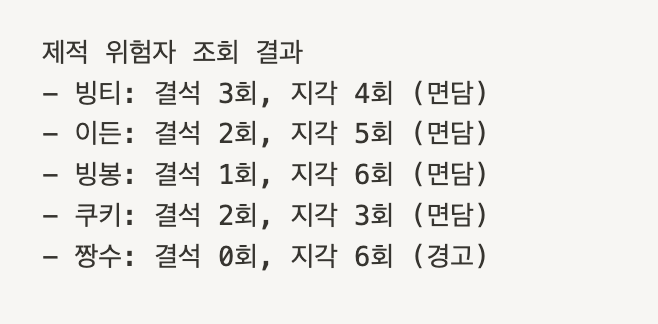 3번 기능이 어차피 조회기능이라 기존 세팅한 출석 기록과 출석/지각/결석 횟수 및 그에 따른 처벌을 출력하면 되기에 3번 기능 먼저 구현했다.