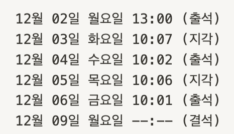 그래야 나중에 출석/지각/결석을 몇 회를 했는지 파악하고 그에 맞는 처벌을 결정할 때 훨씬 쉬울 것 같았다.