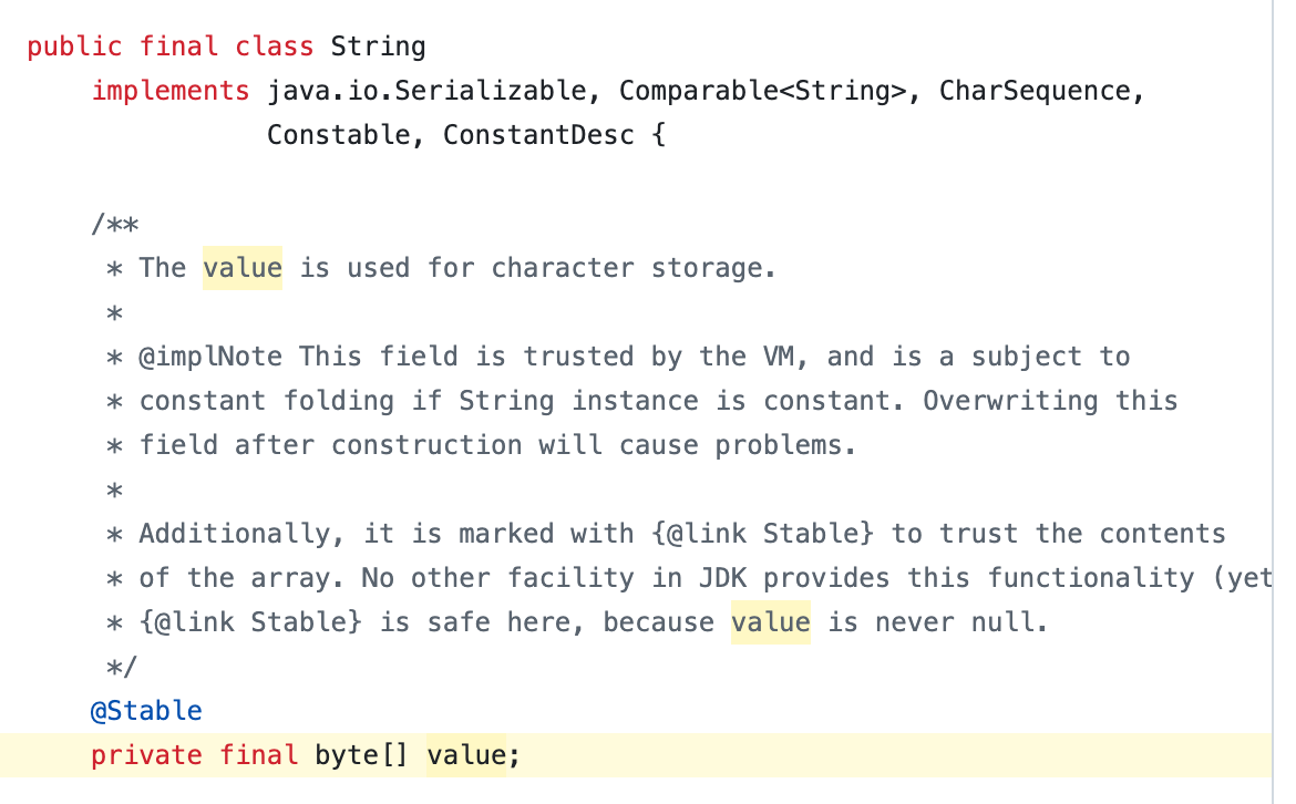 - `value` : String 클래스 내부에서 문자열 데이터를 저장하는 필드
