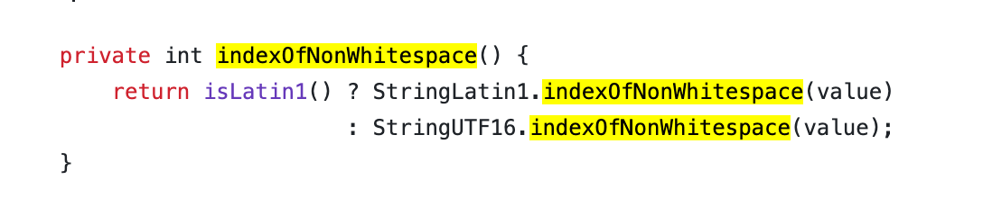 - `StringLatin1.indexOfNonWhitespace(value)` : Latin-1 문자열에서 공백이 아닌 첫 번째 문자의 인덱스 반환