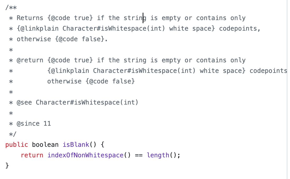 백그라운드에서 `isBlanck()`메서드는 첫 번째 비공백 문자의 인덱스를 검색한다.
