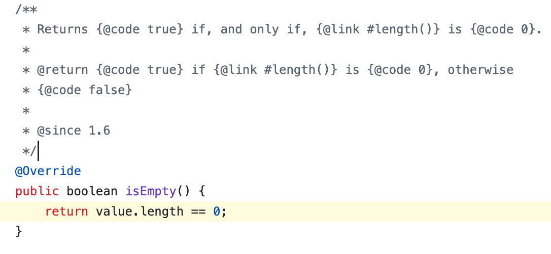 내부적으로 `isEmpty()`는 `String`객체의 텍스트를 나타내는 바이트 배열의 길이에 의존한다.