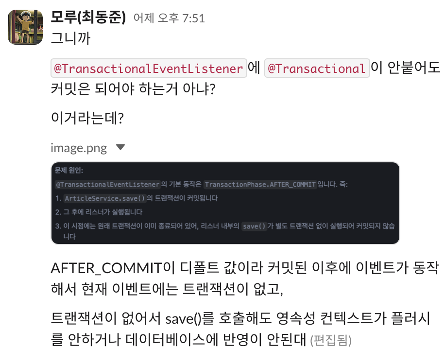 그래서 트랜잭션을 분리하기 위해 계속 AFTER_COMMIT을 유지하기로 했다.