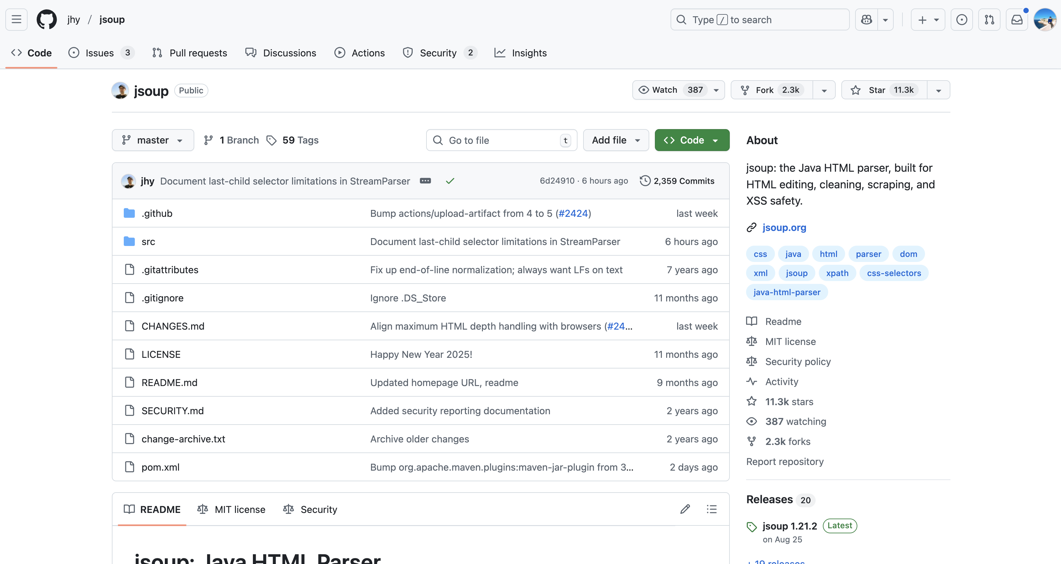 반대로 단점도 분명하다. 그냥 “HTML 태그만 빠르게 걷어내고 텍스트만 얻고 싶다” 정도의 요구라면, HTMLCleaner는 조금 과한 선택일 수 있다. 구조를 정리하고, 트리를 만들고, 다시 출력할 수 있는 기능까지 포함하다 보니, 단순 태그 제거만 필요한 경우에는 오버스펙에 가까운 느낌이다. 게다가 Jsoup처럼 친숙한 문법과 풍부한 예제를 제공하는 라이브러리는 아니라서, 처음 접하는 입장에서는 문서나 API 스타일이 다소 낯설게 느껴질 수도 있다. 프로젝트 분위기도 최신 트렌디한 라이브러리라기보다는 “꽤 오래된 도구”에 가깝다.