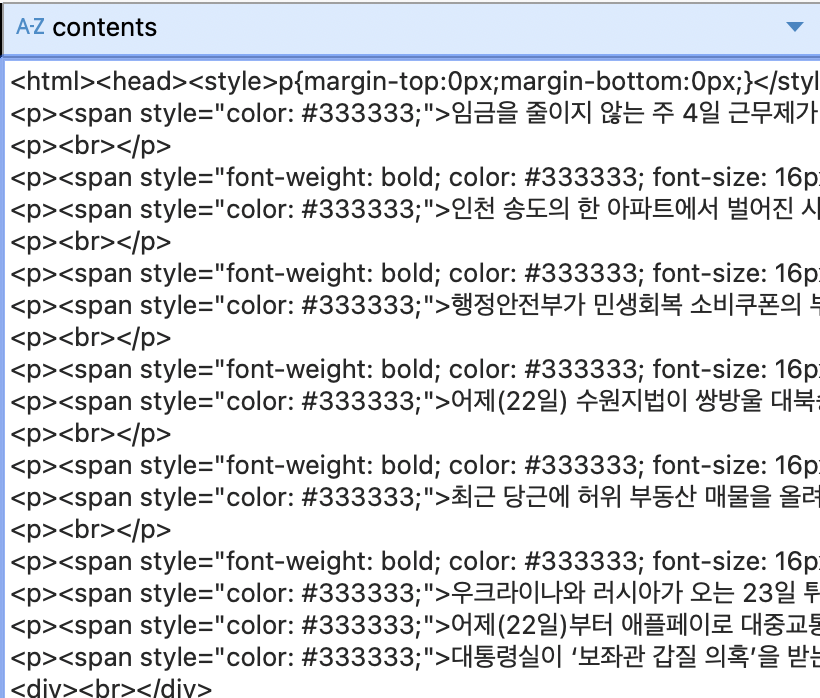 현재 `contents`에는 HTML 태그를 포함한 본문 전체가 들어 있다.