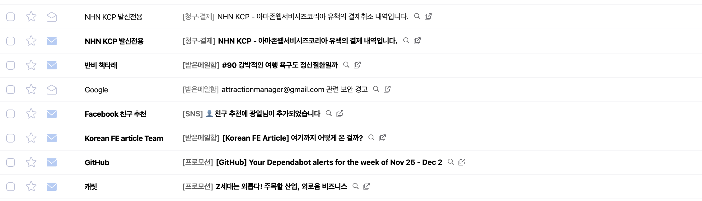 메일 종류를 보면 결제 내역, 뉴스레터, facebook, github 등등 뒤죽박죽 섞여있습니다.